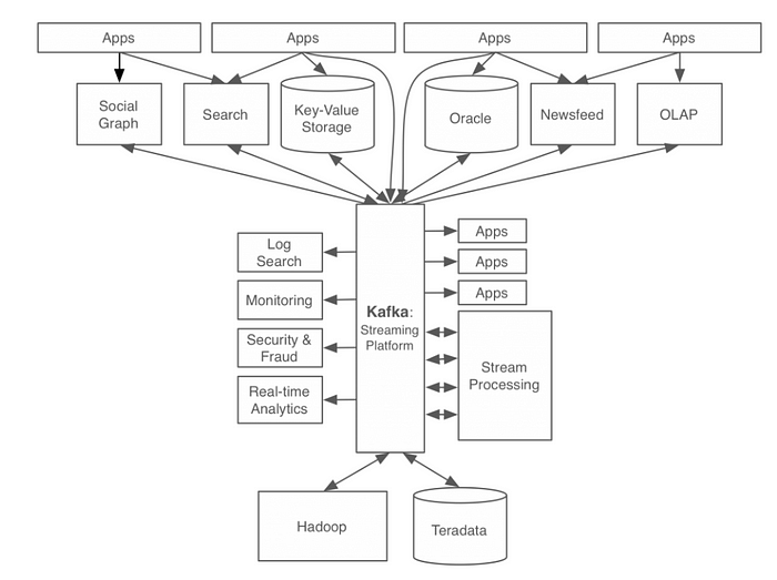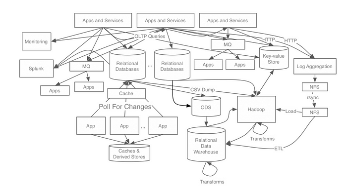 LinkedIn이 Kafka 를 사용 하기 전 내부 시스템 구조를 보면 매우 복잡한 구조 이면서 개별적인 연결을 하는 구조였기 때문에 확장 에도 어려움이 분명 존재했다.