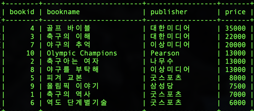 | (ex_ "도서를 가격순으로 검색하고, 가격이 같으면 이름순으로 검색하세요.") SELECT * FROM Book ORDER BY price,bookname; ![]() (ex_ "도서의 가격을 내림차순으로 검색하고, 만약 가격이 같다면 출판사의 오름차순으로 출력하세요.") SELECT * FROM Book ORDER BY price DESC,publisher ASC; (DESC: 내림차순 ASC: 오름차순) ![]() |