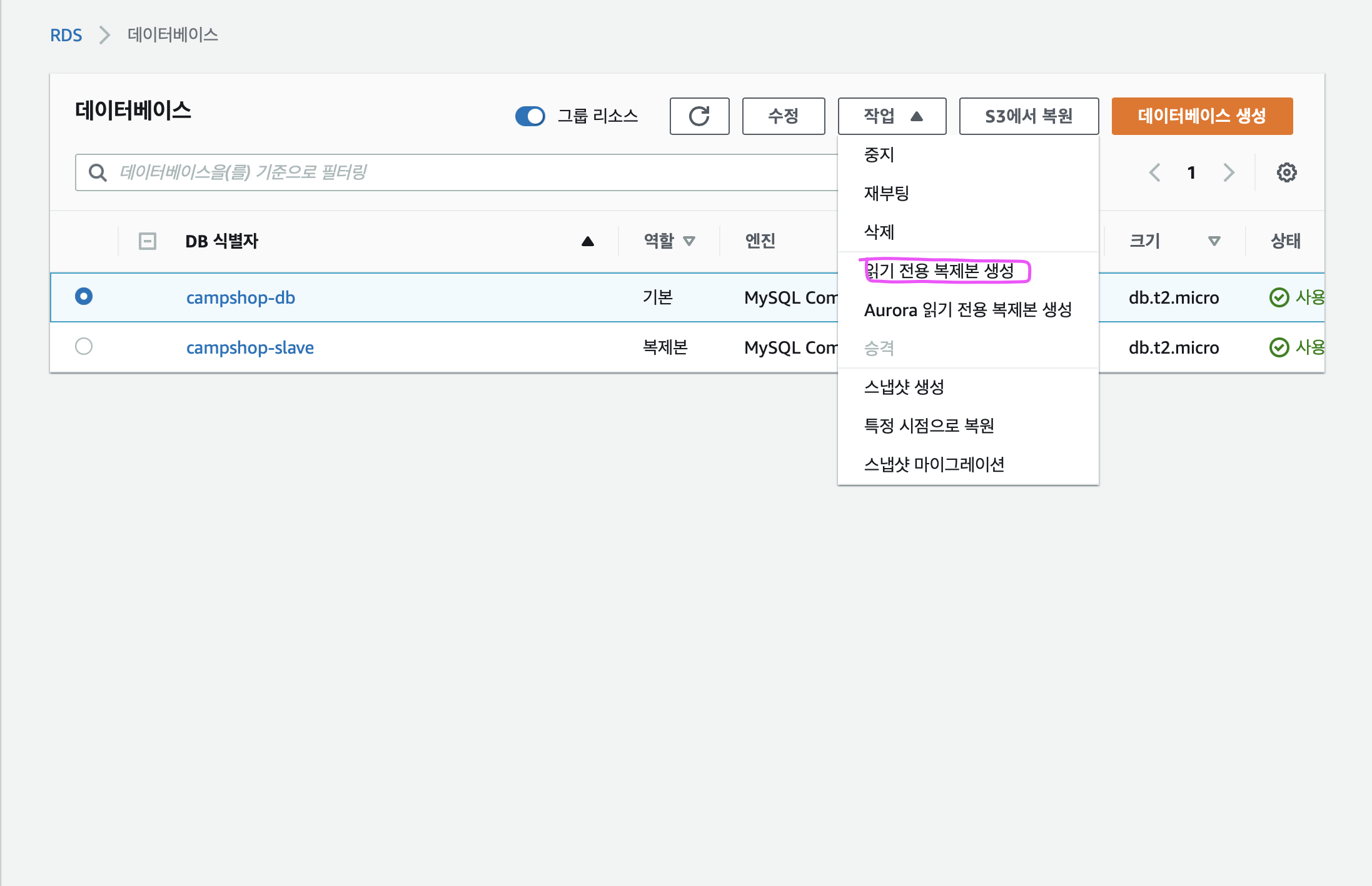 ์ฐ์ AWS ์ ์ํ ๋ค ์๋น์ค์์ RDS๋ก ๋ค์ด๊ฐ ๋ณธ์ธ์ด ์์ฑํ DB์ธ์คํด์ค๋ฅผ ์ ํํ๋ค.