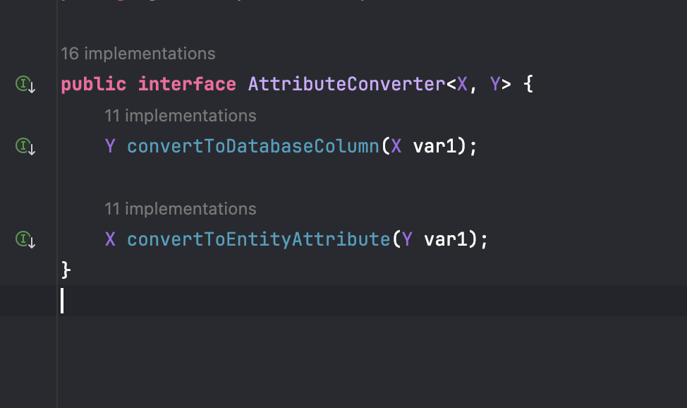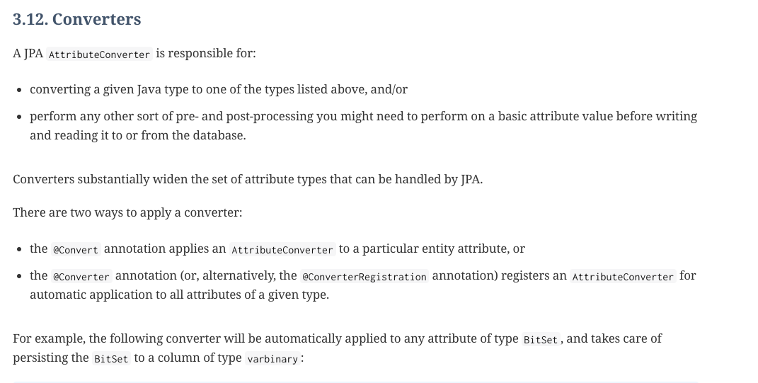 JPA entity에서 Enum 값을 사용하는 경우 흔히 아는 건 ORDINAL, STRING 옵션이다.  하지만 서비스를 구성하다 보면 DB에 특정 코드가 들어가야 하는 경우도 분명 있을 거다. 예시를 한번 보자 이런식으로 ENUM이 구성되어 있을 때 별도의 설정 없이 사용하면 ORDINAL 값인 인덱스 값이 들어가고 옵션을 STRING으로 설정하면 ENUM의 이름 자체가 DB에 인서트 될 것이다. 하지만 만약 저 code 값을 DB에 넣어주고 싶다면 어떻게 해야 할까위 이미지는 Hibernate 공식 페이지의 설명이다. 열거형 옵션에는  ORDINAL, STRING만 지원을 하고 다른 옵션은 제공하지 않는다. 하지만 바로 아래로 내려가면  Converters라는 내용이 있다. 대충 설명하자면 주어진 ..