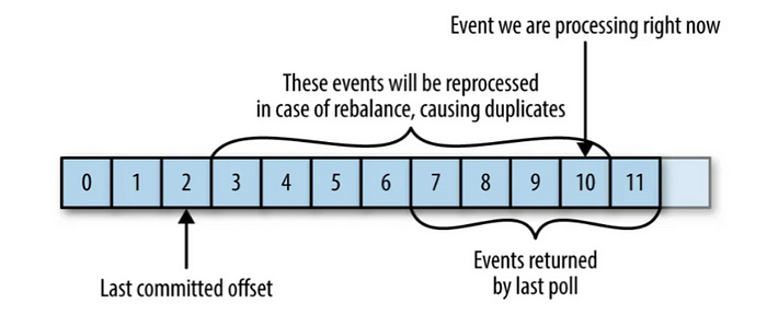 3. 그 다음 8까지 실행 후 Commited Offset 실행 중 오류가 발생해서 리벨런싱이 실행되고 메시지를 가지고 있던 파티션의 소유주가 컨슈머 B라고 생각하자. 여기서 중복 메시지가 발생한다. 소유권을 가진 컨슈머 B는 Committed Offset이 4인줄 알게된다. 위에서 8까지 실행 후 offset commit에 실패 했기 때문이다. 이러면 이미 읽어들인 메시지를 또 읽어 중복으로 메시지를 읽는 현상이 발생한다.