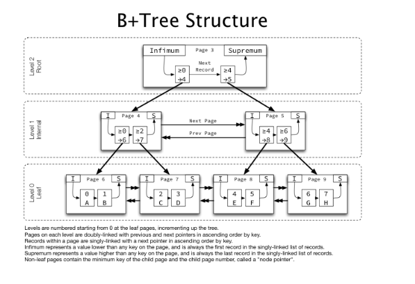 B-Tree 는 트리 구조이며 최상위에 “root Node” 가 존재하고 그 하위에 자식 노드가 붙어 있는 형태이고 ,“branch Node” 라는 중간 노드와 “leaf Node” 라는 최하위 노드가 존재한다.