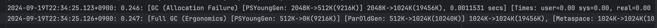 이제 힙 메모리 공간을 설정하고 GC 로그를 활성화한 다음 Java를 실행시키면 GC가 동작하는 걸 볼 수 있다.