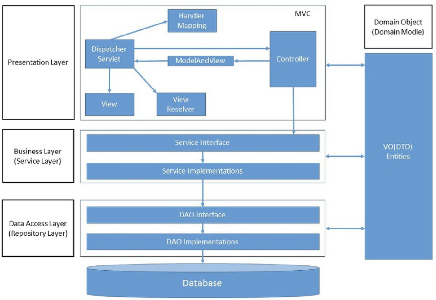 View로부터 받아온 DTO를 Controller에서 도메인(Entity)으로 변환하고 서비스 계층에게 이를 전달하여 작업을 수행하고 서비스 계층은 Controller에게 도메인을 반환하고, Controller는 도메인을 DTO로 변환해 View로 응답을 보낸다.